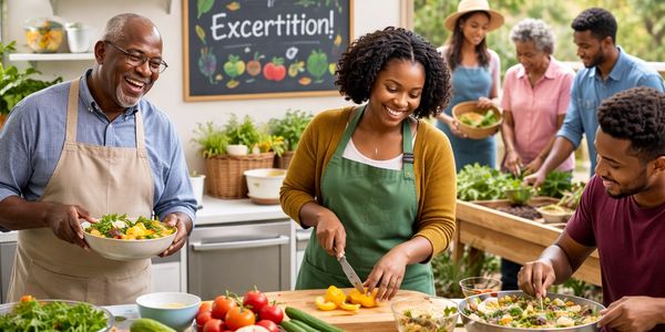 Excertrition emphasizes practical learning. Participants engage directly in cooking demonstrations, shared meal preparation, and basic edible gardening activities. Instruction includes reading food labels, meal planning on a budget, reducing sodium and added sugars, minimizing food waste, and incorporating movement in accessible, non-stigmatizing ways. The program is delivered through workshops and retreat-based sessions that support learning, connection, and stress reduction.